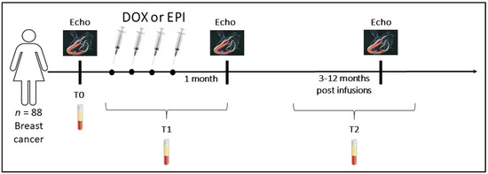 Experimental design. Eighty-eight breast cancer patients were enrolled and treated with doxorubicin (DOX) or epirubicin (EPI). Thick black vertical bars indicate experimental time-points when echocardiography was performed and blood samples collected.