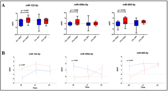 Following the screening step, we analyzed the expression of the putatively regulated miRNAs in all T0 samples by single assays. Moreover, miR-1-3p, miR-34a-5p and miR-499a-5p were evaluated based on their known involvement in cardiac diseases and DOX-induced cardiotoxicity [24]. Our results showed that miR-122-5p (p = 0.007), miR-499a-5p (p = 0.029) and miR-885-5p (p = 0.035) presented a higher expression in DOX cTn+ vs. in DOX cTn− patients (Figure 3A and Table S6). These differences were not observed in EPI subjects and no difference in miR-1-3p or miR-34a-5p expression was observed in either treatment group. Conversely, we did not confirm any significant modulation of the miRNAs detected in the screening phase in the EPI group.