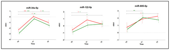 Circulating miRNAs modulated upon anthracycline treatment. Time course for miR-34a-5p, -122-5p and -885-5p showing modulated expression in DOX (red) and EPI (green) patients. Vertical bars represent mean –ΔΔCT ± SEM. Green, DOX; Orange, EPI. * p < 0.05; ** p < 0.01; *** p < 0.001.