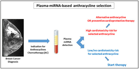 Circulating miRNAs as Anthracyclines Chemotherapy decision-makers. Flow chart of the possible use of plasma miRNA assessment at baseline to help clinicians in selecting drugs with the lowest cardiotoxicity risk and/or deciding whether to start cardioprotective preventive therapies.