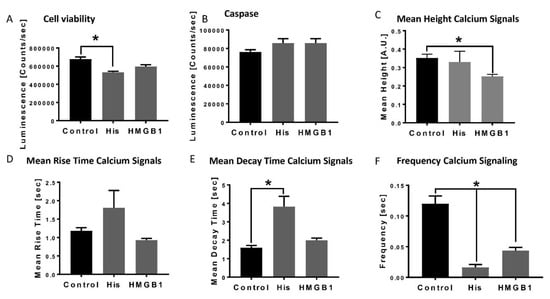Decrease in cardiomyocytes viability, apoptosis and alterations of calcium handling in the presence of HMGB-1 and histones: Cell viability of human cardiomyocytes (Luminescence in counts/sec) in the presence of 20 µg/mL histones (His) and 100 ng/mL HMGB-1 (37 °C, 6 h) compared to the control (PBS) (A). Caspase-3/7 activity (counts/sec) in human CMs in the presence of histones and HMGB-1 (B). Mean Height calcium signals (A.U) in the presence of histones and HMGB-1 compared to the control (C). Mean rise time (sec) (D) and mean decay time (sec) (E) of calcium peaks of human CMs in the presence of histones and HMGB-1. Frequency of calcium signals (sec) in human cardiomyocytes treated 20 µg/mL histones and 100 ng/mL HMGB-1 (F). Results are presented as mean ± SEM, for all experiments n = 6. Indicated results were significant * p < 0.05.