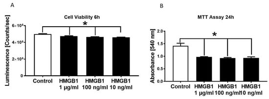 Cell viability of HL-1 cells were significantly reduced in the presence of 1 µg/mL, 100 ng/mL as well as 10 ng/mL HMGB-1 (Figure 2A). By conducting the MTT assay, we detected a reduction of metabolic activity in the HL-cells in the presence of all tested HMGB-1 concentrations (Figure 2B).