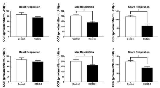 Metabolic alterations of human cardiomyocytes (CM) in the presence of histones: Basal respiration (OCR in pmol/m in/Norm. unit) of human CMs in the presence of 20 µg/mL histones (37 °C, 6 h) (A). Maximal respiratory capacity (OCR in pmol/m in/Norm. unit) of human CMs in the presence of 20 µg/mL histones compared to the control (PBS) (B). Spare respiration (OCR in pmol/m in/Norm. unit) of human CMs in the presence of 20 µg/mL histones (37 °C, 6 h) (C). Basal respiration (D), max respiratory capacity (E) and spare respiration (F) of human CM in the presence of 100 ng/mL HMGB-1. Results are presented as mean SEM, for all experiments n = 6. Results are significant * p < 0.05, statistical analysis with t-test.