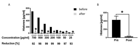 Hemadsorption—a therapeutic option to eliminate systemic extracellular histones. (A). Hemadsoption of different concentrations of histones (700, 500, 300, 200, 100, 50, 25 µg/mL) presented as percentage of reduction (%) after 6 hrs incubation time; for all concentrations n = 6. (B). Histone levels in blood plasma of 22 multiple injured humans (µg/mL) in the Emergency room (pre) and after hemadsorption for 6 h (post). Results were presented as SEM, * p < 0.05.