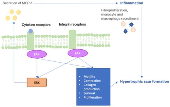 Focal adhesion kinase (FAK), which is a non-receptor cytoplasmic tyrosine kinase, is one of the key mediators of skin mechanobiology and it is activated after cutaneous injury [27,55]. Mechanical forces potentiate the activation of FAK through phosphorylation following injury of the skin [56,57,58]. FAK contributes to cell signaling through its linking of mechanical stress from the ECM to the cytoplasmic cytoskeleton [59], activating inflammatory pathways. Fibroblasts are recruited to the wound by inflammatory signaling, where their secretion of profibrotic cytokines brings about increased collagen synthesis.