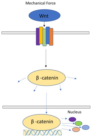 Wnt/ β-catenin signaling pathway. Wnt molecules attached to the respective frizzled-receptors made more prone by mechanical force, releasing β-catenin molecules into the cytoplasm, where they are free to participate in other signaling pathways and can travel to the nucleus. Here, they serve as upstream regulators for other molecules.