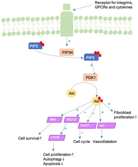 The PI3K/Akt pathway can be activated in different ways, as for example by G-protein coupled receptors (GPCRs), integrin or cytokine receptors and it represents a mediator between ECM and fibroblasts’ cell cycle. In this figure, PI3K-dependent phosphorylation and activation of Akt is represented, which in turn leads to enhanced proliferation and cell survival. Furthermore, apoptosis is regulated, and vasodilatation is promoted.