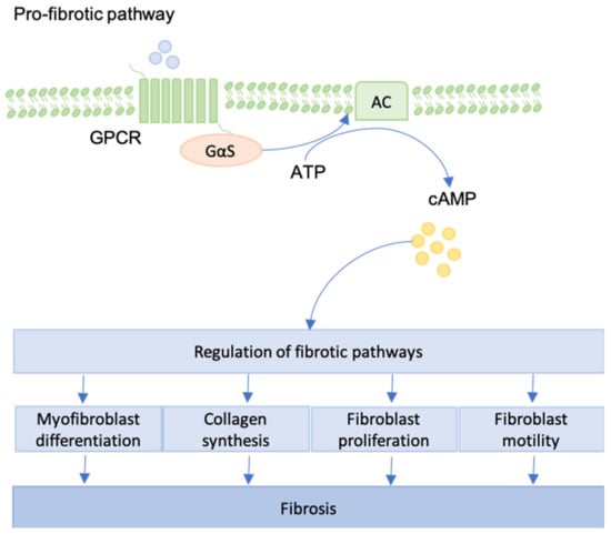 G protein-coupled receptors (GPCRs) are characterized by the presence of seven transmembrane domain proteins and they are activated by focal adhesion complexes [114]. GPCRs can promote both pro-fibrotic and anti-fibrotic phenotypes in fibroblasts. Receptor class and downstream signaling pathways determine whether fibrosis is supported or not [115] (Figure 7).