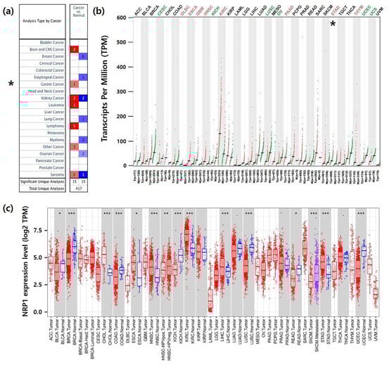NRP1 expression in various cancers and normal tissues was analyzed using the Oncomine, Gene Expression Profiling Analysis (GEPIA2) and Tumor Immune Estimation Resource (TIMER) databases. In the Oncomine database, a tumor microarray database, was used to compare the transcription levels of NRP1 between tumor and corresponding normal tissues in different types of cancer [27,28]. The threshold was determined according to the following values: p-value < 1 × 10−4, fold-change > 2, and gene ranking top 5%. GEPIA2 can assess the effect of 9736 tumors and 8587 normal samples from The Cancer Genome Atlas (TCGA) and the GTEx projects [29,30]. Expression level of NRP1 across 33 TCGA tumors was compared to normal TCGA and GTEx data using GEPIA2. TIMER database supplies an analysis of relative expression of the gene across tumor and normal tissues [31,32]. NRP1 expression was analyzed in cancers to compare with normal tissues.