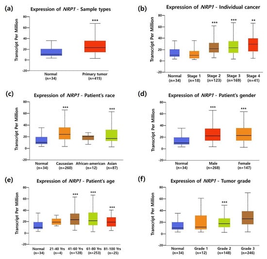 UALCAN database, using TCGA transcriptome and clinical patient data, provides the expression level of genes and patient characteristics [33,34]. The association between mRNA levels and promoter methylation of NRP1 and clinicopathological features was analyzed to determine the prognostic value of NRP1 in patients with stomach adenocarcinoma (STAD). mRNA levels and promoter methylation of NRP1 were separately analyzed with STAD patient characteristics, including individual cancer stage, age, histological subtype, race, gender, and tumor grade, compared to the normal tissues.
