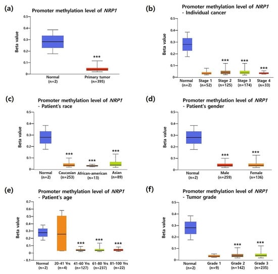 To investigate the association between NRP1 mRNA expression and the clinicopathological characteristics of STAD, we analyzed TCGA data using the UALCAN database. Compared to normal tissues, NRP1 mRNA expression was significantly increased in most clinicopathological characteristics of STAD; tumor stage (Stage 2, Stage 3 and Stage 4), race (Caucasian and Asian), gender (male and female), age (41–60, 61–80, and 81–100 years old), and tumor grade (Grade 2) as shown in Figure 2a–f. Overexpression of NRP1 mRNA in STAD was further confirmed by another two datasets from Oncomine analysis (Supplementary Figure S2). It is known that promotor methylation is an epigenetic regulatory factor and abnormal methylation is evident in tumors [38]. DNA hypomethylation is found to be involved in the invasion and metastasis processes of gastric cancer cells [39]. In particular, hypomethylated NRP1 gene has a positive correlation with poor prognosis in gastric cancer [40]. Here, Figure 3a shows that promoter methylation was significantly reduced in STAD compared to normal tissues. Moreover, promotor methylation levels were significantly reduced regardless of patient characteristics, including tumor stage, gender, race, age, and tumor grade (Figure 3b–f). Taken together, these data confirmed upregulation of NRP1 mRNA expression and downregulation of promoter methylation in STAD.