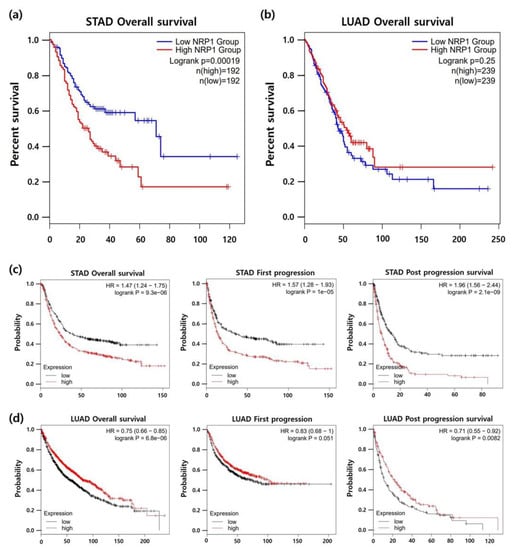 Correlation between NRP1 expression and patient survival in STAD and lung adenocarcinoma (LUAD). Kaplan-Meier survival curves were generated using the GEPIA2 website. Patient’s survivals were compared between two groups divided at median value of NRP1 expression as higher (red) and lower (blue) in TCGA data. (a) STAD; n = 384, (b) LUAD; n = 478. Survival curves of overall survival (OS), first progression (FS), and post progression survival (PPS) in (c) STAD and (d) LUAD using Kaplan-Meier plotter with best cut-off option [35]. The prognostic value of NRP1 using TIMER database is presented in Supplementary Figure S3.