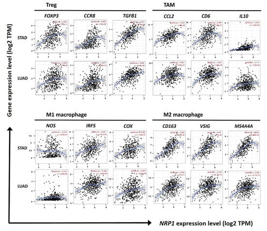 Tumor microenvironment (TME) consists of immune cells, stromal cells, and soluble factors, as well as cancer cells. It is known that TME plays an important role in the progression of tumors by interacting with other cells [41,42]. Especially, Treg cells and M2 macrophages are well known as potent immunosuppressive cells. Therefore, in TME, Treg cells and M2 macrophages induce the metastasis and growth of tumor cells by inhibiting the anti-tumor function of various effector cells, such as NK cells, CD8+ T cells, and γδ T cells [21,43,44]. To investigate factors related to patient survival rates that are regulated by NRP1 expression, association of NRP1 expression and infiltration of immune cells was analyzed in STAD. As shown in Figure 5 and Table 1, the correlation between NRP1 expression and various gene expressions of immune cell markers was determined using TIMER web tool. Most of the immune cell marker genes showed a positive correlation with NRP1 expression, but among them the marker gene expression of Treg cells and M2 macrophages showed the most strong positive correlations with NRP1 expression in STAD. Strong positve correlation was confirmed in different dataset using R2 platform as shown in supplementary Table S4. However, there was weak or no significant correlation in LUAD used as negative control compared to STAD.