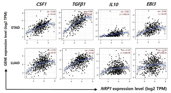 Correlation of NRP1 expression and gene markers of cytokine (CSF1, TGFβ1, IL-10, and EBI3). Correlation of NRP1 expression with cytokine gene markers was examined using TIMER. A significant positive correlation between NRP1 expression and CSF1, TGFβ1, IL-10, and EBI3 were observed in STAD. However, correlation of NRP1 expression with cytokine gene markers in LUAD was weak compared to STAD. Correlation constants between NRP1 and gene markers of cytokine are presented in Supplementary Table S5.