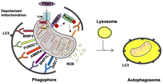 The PINK1/Parkin-independent pathway of mitophagy relies on the activity of a set of OMM-localized receptors, including B-cell lymphoma 2 (BCL2)-interacting protein 3 like (BNIP3L/NIX), FUN14 domain-containing 1 (FUNDC1), BNIP3, autophagy, and Beclin-1 regulator 1 (AMBRA1), BCL2-like 13 (BCL2L13), FKBP prolyl isomerase 8 (FKBP8), and disrupted-in-schizophrenia-1 (DISC1) [33] (Figure 1). These receptors detect damaged mitochondria by interacting with processed LC3 at phagophores via a common LC3-interacting region (LIR) motif in their cytosolic N-terminal domains. The description of these pathways does not fall within the scope of this review and can be found elsewhere [33].
