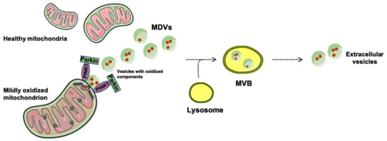 Different from mitophagy, a shuttle system operating via the generation and release of EVs is in place to dispose of mildly damaged mitochondria. This system operates independent of mitochondrial depolarization, autophagy signaling, or mitochondrial fission [64]. Indeed, cells lacking autophagy-related serine/threonine kinase gene (Atg) 5, Beclin-1, or RAB9, as well as silenced for DRP1, are still able to generate MDVs [64].