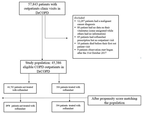 We included all the participants registered with outpatient clinic visits. Study entry was defined as the first outpatient clinic visit for the non-roflumilast group. As far as the roflumilast group was concerned, we included them after the first prescription of roflumilast was received after their first outpatient clinic visit. Exposure to roflumilast was defined as collection of at least one prescription of ATC-code R03DX07 after study entry.