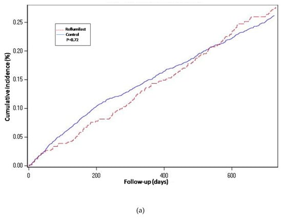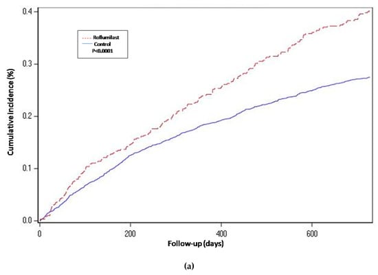 We used the unadjusted Cox proportional hazard model to conduct the survival analyses on the matched population. Since mortality was comparable among participants in the roflumilast group and the control group, we did not adjust for mortality during the main outcome analyses (competing risk). We conducted all analyses using SAS 9.4, Cary, NC, USA.