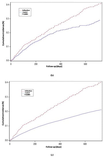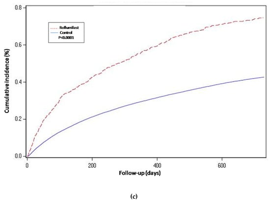 Hospital-requiring acute COPD exacerbation. Cumulative incidence for the three compared groups. (a) Propensity-matched population (Roflumilast vs. Control): Unadjusted Cox proportional hazard model (matched on FEV1, MRC, age, gender, smoke status, number of AECOPD-Hosp 1 year prior to baseline, ICS prescription and LAMA/LABA prescription). (b) Roflumilast versus Theophylline: unadjusted Cox proportional hazard mode (Propensity score matched on FEV1, MRC, age, gender, smoke status, number of AECOPD-Hosp 1 year prior to baseline, ICS prescription, LAMA/LABA prescription and calendar year). (c) Unmatched population (Roflumilast vs. Control): adjusted Cox proportional hazard model (adjusted for FEV1, MRC, age, gender, smoke status, number of AECOPD-Hosp 1 year prior to baseline, ICS prescription and LAMA/LABA prescription). Follow-up period of two years.