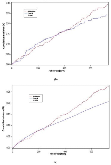 Cumulative incidence curves for all-cause mortality. (a) Propensity-matched population (Roflumilast vs. Control). (b) Roflumilast versus Theophylline. (c) Unmatched population (Roflumilast vs. Control).