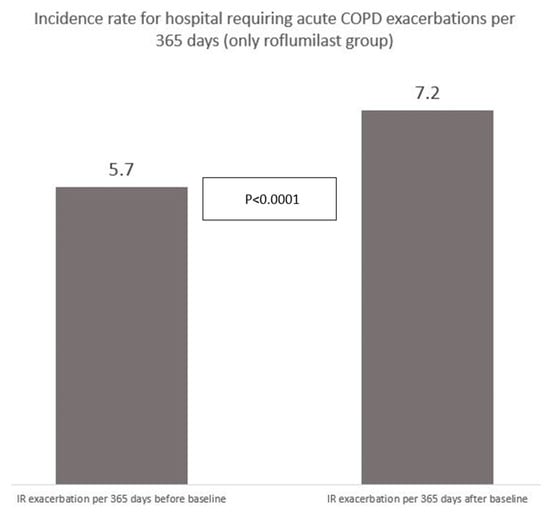 Incidence rate of hospitalization-requiring acute exacerbations for 594 participants receiving roflumilast before and after starting up with roflumilast (AECOPD/365 days).