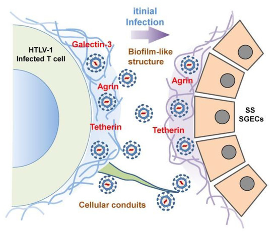 - Nakamura, H.; Shimizu, T.; Takatani, A.; Suematsu, T.; Nakamura, T.; Kawakami, A. Initial human T-cell leukemia virus type 1 infection of the salivary gland epithelial cells requires a biofilm-like structure. Virus Res. 2019, 269, 197643. [Google Scholar] [CrossRef]