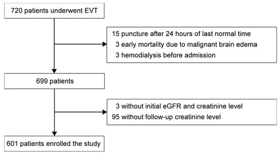 During the study period, a total of 720 patients were enrolled in the ASIAN KR registry. After excluding 21 patients because they had undergone EVT more than 24 h after onset, because of early mortality due to malignant brain edema, or because of hemodialysis before admission, 699 patients were eligible for this study. Of these, 98 patients lacked baseline or follow-up renal function tests. Finally, 601 patients (86.0%) were included in our analysis (Figure 1). The mean age of the included patients was 68.0 ± 12.2 years, and 333 patients (55.4%) were men. CTA before EVT was performed in 510 patients (84.9%), and the mean dose for CTA was 82.6 ± 7.6 mL. The mean dose of the contrast agent was 71.2 ± 37.2 mL, and 452 of the included patients (75.2%) had successful reperfusion. Patients with successful reperfusion used smaller amounts of the contrast agent than those with unsuccessful reperfusion (68.5 ± 36.0 vs. 79.1 ± 39.5 mL, p = 0.004). Most of the excluded patients (95 patients, 96.9%) were excluded due to missing follow-up creatinine levels. The excluded patients tended to be younger than the included patients (68.0 ± 12.2 years vs. 63.8 ± 12.6 years, p = 0.003) and had better baseline renal function (eGFR: 64.6 ± 26.1 vs. 72.4 ± 24.6 mL/min/1.73 m2, p = 0.005) and less severe stroke (initial NIHSS: 17 (13–21) vs. 14 (9–18), p < 0.001). None of the excluded patients required renal replacement therapy during their hospital stay. The excluded patients also showed better clinical outcomes at 3 months (mRS 3 (1–5) vs. 1 (0–2), p < 0.001) (Table S1).