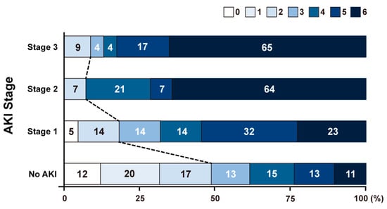 Follow-up was conducted at 3 months for all patients to determine functional outcome and mortality. There were 330 patients (54.9%) who showed poor functional outcomes at 3 months. Of the 59 patients with AKI, 52 (88.1%) showed poor outcomes, and only seven (11.9%) showed good outcomes (p < 0.001) (Table S2). In the multivariate analysis, the presence of AKI was independently associated with a poor outcome (odds ratio, 5.145; 95% CI, 2.177–13.850; p < 0.001) (Table 3, Model 1). AKI Stage 2 (odds ratio, 13.709; 95% CI, 2.108–280.187; p = 0.022) and Stage 3 (odds ratio, 6.028; 95% CI, 1.452–42.593; p = 0.030) was also associated with a poor functional outcome at 3 months (Table 3, Model 2 and Figure 2). Baseline renal function showed an association with functional outcome (p value for trend = 0.005); however, it did not show an independent association in the multivariate analysis. The dose of contrast medium used was also associated with a poor functional outcome (odds ratio, 1.080 per 10 mL increase; 95% CI, 1.013–1.155; p = 0.021).