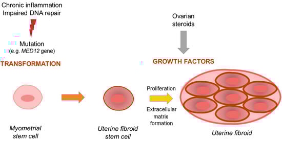 Development and growth of uterine fibroid—simplified scheme. Importance of mutation-derived transformation and stimulation of hormones and growth factors.
