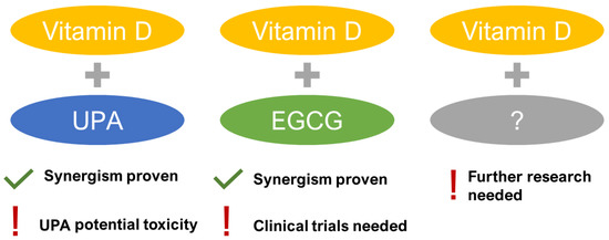 Limited clinical trials are available. In 2016, Ciavattini et al. found that vitamin D-treated women presented with reduced disease progression in small UFs [80]. In a controlled study by Porcaro et al. in 2020, women with symptomatic UFs were treated with vitamin D together with epigallocatechin gallate (EGCG) and vitamin B6 for 4 months. The study found that total UF volume decreased by 34.7% in the treated group but increased by 6.9% in the control group. Authors concluded that such a combination might be a new form of non-hormonal treatment for women with UFs [81]. The concept of potential synergisms was also studied in the vitamin D and UPA combination with encouraging anti-UF effects both in UF cells [82] and in patients [83]. Both studies concluded that there might be a potential synergism between UPA and vitamin D to treat UFs [82,83]. However, the recent safety concerns of UPA induced liver injury ceased advancing the studies and consequently new synergisms are still to be explored (Figure 2).