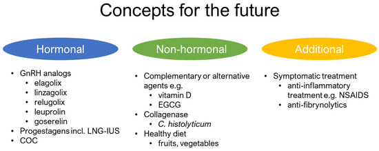 Collagenase is an enzyme that has an effect on collagen and produced by the bacterium Clostridium histolyticum [208]. Since the year 2010, after approval from United States FDA, it has been widely used for fibrotic-dependent disease, e.g., in Dupuytren’s contracture [209]. Since UFs contain a great percentage of abundant and disorganized collagen-rich ECM, this anti-collagen enzyme may serve as an efficient non-hormonal treatment option. Brunengraber et al. assessed the potential utility of this agent as treatment for UFs in human samples collected after hysterectomy. Authors found that the relative percentage of collagen-stained area in UF-injected samples was less than that in both control samples and treated myometrium. The main limitation is the heterogeneity of ECM and collagen which might contribute to varied responses and needs additional studies [209]. Jayes et al. used a highly purified collagenase Clostridium histolyticum to explore how it reduces the stiffness of UF tumor. The authors used 3 doses of collagenase. Longer incubation time caused greater reduction in tumor stiffness, shape, and consistency. The authors concluded that the reduction of tissue stiffness is of much importance as it might decrease bulk symptoms and lead to UF volume decrease, probably leading also to pain and bleeding reduction [210]. These promising data brought this agent to the first phases of clinical trials where it was studied in humans.