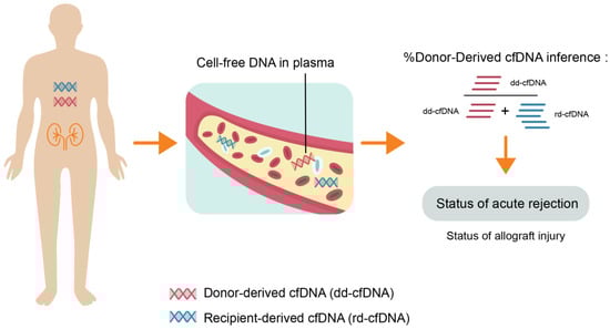 Detection of dd-cfDNA in the blood circulation is an early marker of injury in solid organ transplantation [45,60,61,62]. The biological rationale for the utility of dd-cfDNA in KTx is that cell damage to the allograft leading up to or during episodes of rejection results in release of DNA in the circulation of the recipient and therefore an uptick in the dd-cfDNA levels [45,55]. In stable KT patients, the level of plasma dd-cfDNA is usually <1%, with one study showing median of 0.21% [45]. A serial change in the level of dd-cfDNA to more than 61% from the first value was considered outside the expected biological variation [55]. Baseline levels of dd-cfDNA are higher in deceased donor vs living donor recipients indicating ischemic reperfusion injury. Levels increase immediately post KT and decrease to about <1% by two weeks post-transplant. After two weeks post-KT, a subsequent increase can indicate renal allograft injury. dd-cfDNA decreases in response to treatment of rejection [53]. Its role in allograft rejection is being actively investigated in many solid organ transplants including kidney, heart, lung and liver [44].