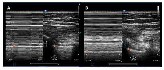 TUS with M-Modus showing the absence of lung sliding (A, “barcode sign” with pneumothorax) and presence of lung sliding (B, “seashore-sign”, no pneumothorax). The difference could be noted in the M-Modus-parts below the star-marked white line, that reflects a regular (B) or missing sliding pleural line, leading to repetitive horizontal lines in the case of a pneumothorax in part (A).