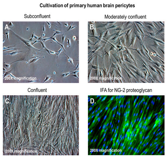 Brain vascular pericytes in vitro. (A–C) Primary human brain pericytes in culture, from low to high confluency; (D) primary human brain pericytes stained with a monoclonal antibody against neural/glial antigen-2 (NG2) proteoglycan. The total magnification is 200× ([], Figure 1A,C).