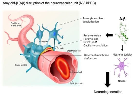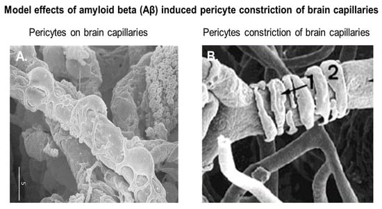 Epidemiologic studies have uncovered a vascular component in the development of AD []. One of the most prominent initial changes in AD pathology is a decrease in cerebral blood flow (CBF) []. Since vascular resistance in the brain parenchyma is associated with capillaries, cerebral pericytes may play a role in the development of AD []. The human blood–brain barrier (BBB) consists of brain microvascular endothelial cells, brain pericytes, and astrocytes; together, they form the neurovascular unit (NVU) [,,]. Pericytes of the BBB play an essential role in several microvascular functions, including angiogenesis, vascular remodeling, and the regulation of microcirculation, as well as the generation and maintenance of the BBB [,,,,]. Pericyte dysfunction has been observed in AD pathology [,,,]. Aβ proteins induce neurovascular dysfunction, which leads to functional changes in the brain microvasculature, subsequently impairing capillaries in their response to neuronal activity [,]. Using human brain slices and a mouse model of AD, Nortley et al. showed that oxidative stress caused by Aβ toxicity leads to capillary constriction via the generation of reactive oxygen species (ROS) by reduced nicotinamide adenine dinucleotide phosphate oxidase 4 (NOX4) []. These ROS then trigger the release of endothelin-1. Endothelin-1 interacts with ETA receptors to cause pericyte contraction and subsequent capillary constriction []. Interestingly, the authors did not observe pericyte constriction in areas of the mouse brains with no Aβ deposition []. Findings from this study suggest that brain vascular pericytes are the link between Aβ proteins and vascular dysfunction in AD [].