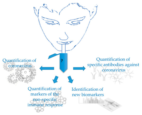 In the particular case of SARS-CoV-2, saliva could be used for evaluating different aspects of the disease, as shown in Figure 1, the evidence for which will be described in the following sections.