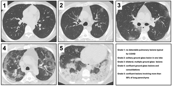 Two radiologists with 8 (F.K.L.) and 3 years of experience (E.B.) performed qualitative image assessment blinded to the clinical data. For each of the 65 patients, chest CTs were evaluated according to the criteria presented in Figure 1. The spectrum of imaging manifestations ranged from grade 1 to 5. The intraclass correlation coefficient was calculated between the assessments.