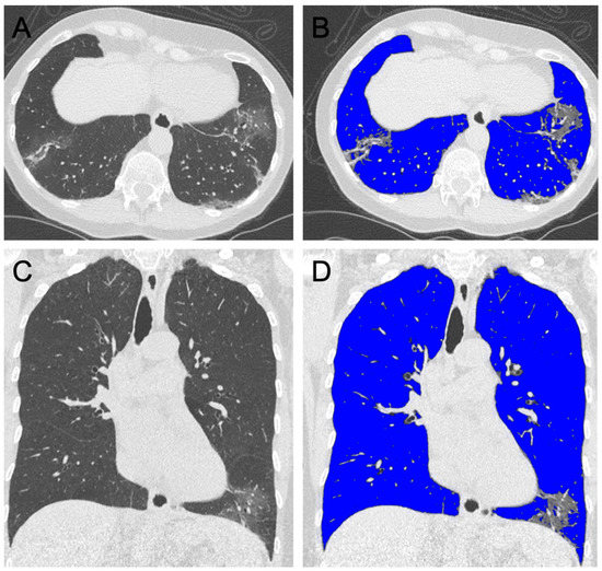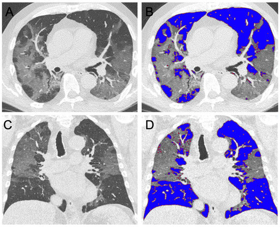 Axial (A,B) and coronal (C,D) reformations of the chest computed tomography (CT) of a 68-year-old female patient presenting with fever and cough. Radiological severity grade 3 was assigned. Lung volume quantification accounted for >90% ventilated volume (shaded blue in B and D).
