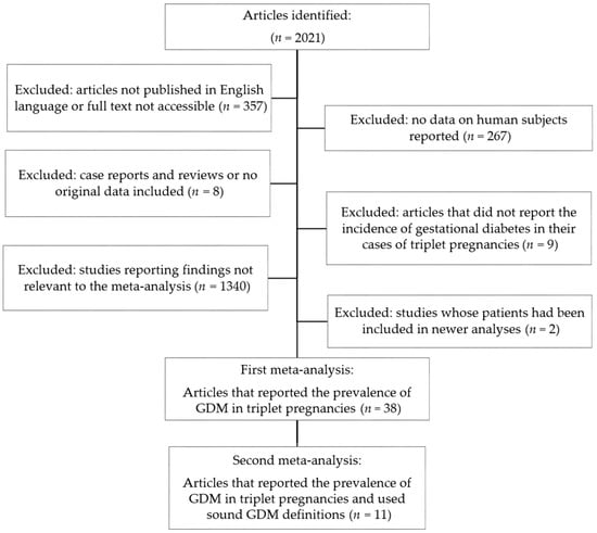 A total of 2021 articles were identified. Of these, 1983 reports were excluded step-by-step. Details are provided in Figure 1. Thus, 38 studies were included in the initial meta-analysis in addition to the present case series. Furthermore, a second meta-analysis was performed which included only those studies with a sound definition of GDM (n = 11): for this meta-analysis, GDM had to be diagnosed using either the 3-h, the 100 g oGTT (n = 7), the 2-h 75 g oGTT (n = 3), or the 1-h glucose challenge test which—in case of any abnormality—was followed by a 3-h, 100 g oGTT (n = 1).