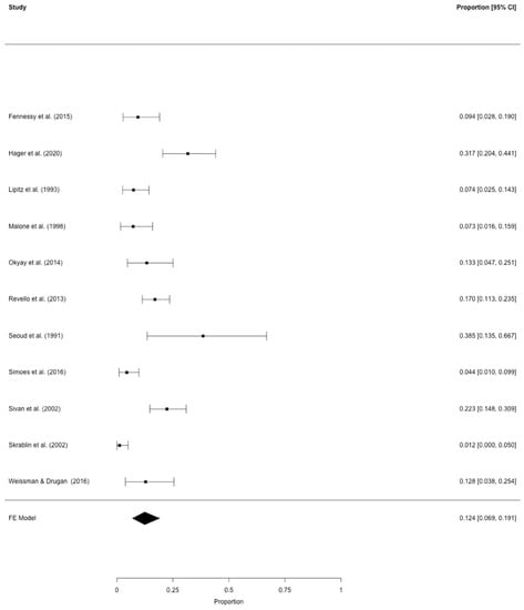 According to the two meta-analyses, 7.3–12.4% of women with triplet pregnancies suffered from GDM. The difference in GDM rates between the two analyses seems clinically relevant. It is likely that this is due to the fact that in the meta-analysis of all 38 studies, which somehow evaluated the GDM prevalence in triplet pregnancies (Figure 1), many did not provide the exact diagnostic criteria for GDM or used definitions that are not considered standard nowadays. We, thus, consider the second meta-analysis (n = 11; Figure 2) with a standardized and currently valid GDM definition (Table 2) more reliable. Accordingly, a pooled GDM prevalence of 12.4% was found in triplet pregnancies. It has been demonstrated that twin pregnancies carry a higher risk of GDM development than singleton pregnancies [8]. Notably, a wide range of GDM prevalence, from about 7% to 20%, has been reported for twin pregnancies [8,61,62,63]. It seems obvious that the results of our meta-analyses lie within that range. Thus, one cannot state that women with triplets would carry a higher GDM risk than those with twins. However, women with triplets are obviously at an increased risk of GDM compared to women with singleton pregnancies, a fact that was also demonstrated by the matched comparison in our patient population (Table 1).
