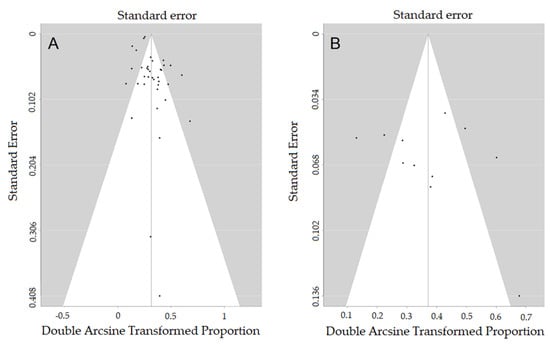 Funnel plots for (A) the meta-analysis of all eligible studies and (B) the meta-analysis of all studies with a sound GDM definition.