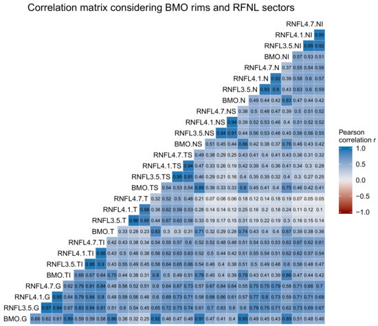 Correlation matrix map among the thickness of the BMO-MRW rims and RNFL sectors. Every cell represents the Pearson correlation coefficient r of the variables at the corresponding row and column. Dark blue represents a strong positive correlation, and light blue represents a weak positive correlation.