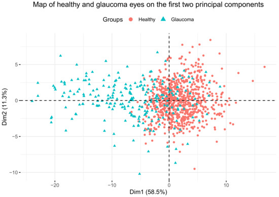 Plotting the subjects’ eyes on the first two principal components (Figure 3) revealed that healthy eyes could easily be discriminated from glaucoma eyes along the first principal component (horizontal dimension), with a small overlapping area, which was not possible at all along the second principal component (vertical dimension).