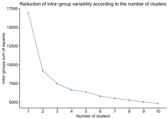 Reduction in the intra-group variability with an increasing number of clusters. According to the elbow criteria, the optimal number of clusters is 3 or 4.