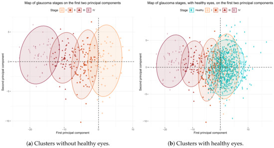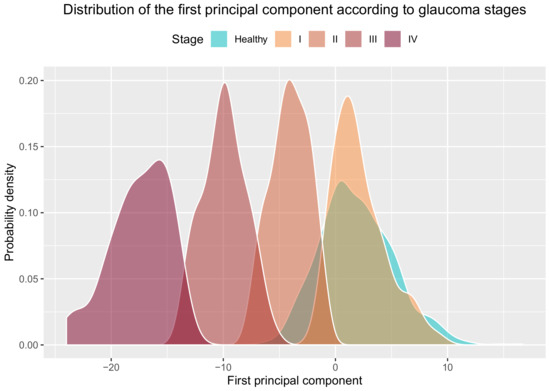 To determine whether the detected classes were related to glaucoma severity, that is, whether a gradient of severity existed from cluster I to cluster IV, we added healthy eyes to the previous plot. In Figure 6b, we see that healthy eyes were plotted to the right of the x-axis (corresponding to the first principal component), overlapping the eyes of cluster I and partially overlapping the eyes of cluster II. This finding is logical as cluster I contained eyes in the early glaucoma stages, which do not differ that much from healthy eyes. Clusters III and IV are located at the other end of the x-axis far from the healthy eyes, which correspond to eyes with severer glaucoma. We can see that cluster IV do not overlap with healthy eyes and the overlap of cluster III is minimal, which comes over more clearly in Figure 7 where the distribution of the first principal component for every glaucoma stage and healthy eyes is depicted.