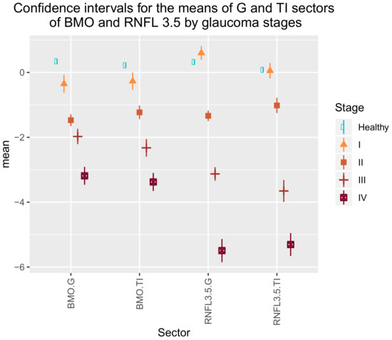 Thus, we decided to use only the G and TI rims of the BMO-MRW and RNFL 3.5 sectors to classify eyes into glaucoma stages. Table 7 shows the coefficients of the model’s linear discriminant functions with these variables. Table 8 provides the main statistics for the distribution of these variables into glaucoma stages. Figure 8 graphically depicts the 95% confidence intervals for the means of these variables by glaucoma stages. As shown in this chart, classes are statistically well defined because for each G or TI sector variable, significant differences () were found among the means of all the stages, except for the means of the healthy and stage I eyes for the TI sector of the RNFL3.5. Another interesting observation was that the mean of the G sector of the RNFL3.5 for stage I glaucoma was higher than the mean of healthy eyes, while the mean for the G and TI rims of the BMO-MRW was lower. As stage I glaucoma overlapped mostly healthy eyes, this result reveals that the BMO-MRW is a better indicator when distinguishing stage I glaucoma eyes from healthy eyes.