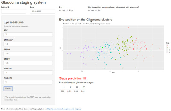 Finally, in order to render this staging system operational, we developed an online application (app) that implemented this classification model. Figure 9 shows a screenshot of the app. In this simple app, the user must provide a subject’s age and the BMO-MRW area, which are required for standardization, and the measurements for rims G and TI of the BMO-MRW and RNFL 3.5 sectors so that the app returns the glaucoma stage prediction for the eye and the probability for each stage. The app also plots the position of the eye on the two first principal components’ planes in relation to the clusters of the different stages. The app is currently available at https://asalberapps.shinyapps.io/Glaucoma-Staging-System/.
