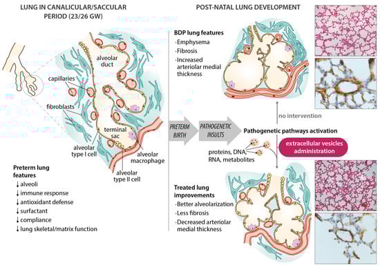 Schematic diagram of bronchopulmonary dysplasia (BPD) pathogenesis, with the main features of the disease in the preterm lung. Microphotographs show improvements in an experimental animal model (60% hyperoxia-induced BPD in rat pups) after administering extracellular vesicles (EVs). Representative lung sections from hyperoxia-induced BPD (top right), and EV-treated animals (bottom right), showing effects of hyperoxia and EVs on alveolarization (upper side of microphotographs; stained with hematoxylin and eosin, scale bars 150 µm) and vessels less than 100 µm in diameter (lower side of the microphotographs; stained with anti-α-smooth muscle actin antibodies, scale bars 23.8 µm). Hyperoxia-induced changes in alveolarization (lower total number of alveoli; larger alveolar volume) and vascularization (increased medial thickness index) are minimized by the intratracheal administration of MSC-EVs.