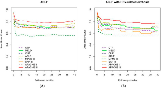 Data from 91 patients with chronic hepatitis B-related cirrhosis underwent subgroup analysis given the high HBV prevalence in Taiwan [25], and patient demographics are shown in Table S2. Time-dependent ROC analysis of the models reveals that the AUROCs of APACHE III and CLIF-C ACLF scores were consistently higher than that of the other six models after 28 days as well as for the overall follow-up period in patients with chronic hepatitis B-related cirrhosis (Figure 1B).