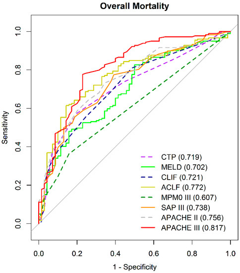The CLIF consortium organ function score (CLIF-C OFs) was developed to simplify and improve the accuracy of ACLF diagnosis and grading [2]. The CLIF consortium acute-on-chronic liver failure score (CLIF-C ACLFs) was subsequently proposed based on the CLIF-C OF scores of patients hospitalized at a single ICU [8]. Another multicenter pilot survey in Japan also demonstrated the utility of the European Association for the Study of the Liver (EASL)-CLIF consortium criteria in outcome prediction [9]. In addition, several generations of the acute physiology and chronic health evaluation (APACHE) score have been developed, and together form a validated ICU prognostic system based on illness severity and a focus on the general health of adult, critically ill, patients [10,11,12,13]. Kuzniewicz et al. demonstrated that the APACHE model provided an excellent predictive accuracy in ICU risk-adjusted mortality (AUC = 0.892) [14]. Two additional ICU mortality prediction models, the mortality probability model III at zero hours (MPM0-III) and the simplified acute physiology score (SAPs) III, use alternative risk-adjustment methods to assess mortality [15,16,17]. Other commonly used prognostic systems for patients with liver cirrhosis include the Child–Turcotte–Pugh (CTP) score, and the model for end-stage liver disease (MELD) score that have been used as major considerations when allocating donor livers in the United States since February of 2002 [18].